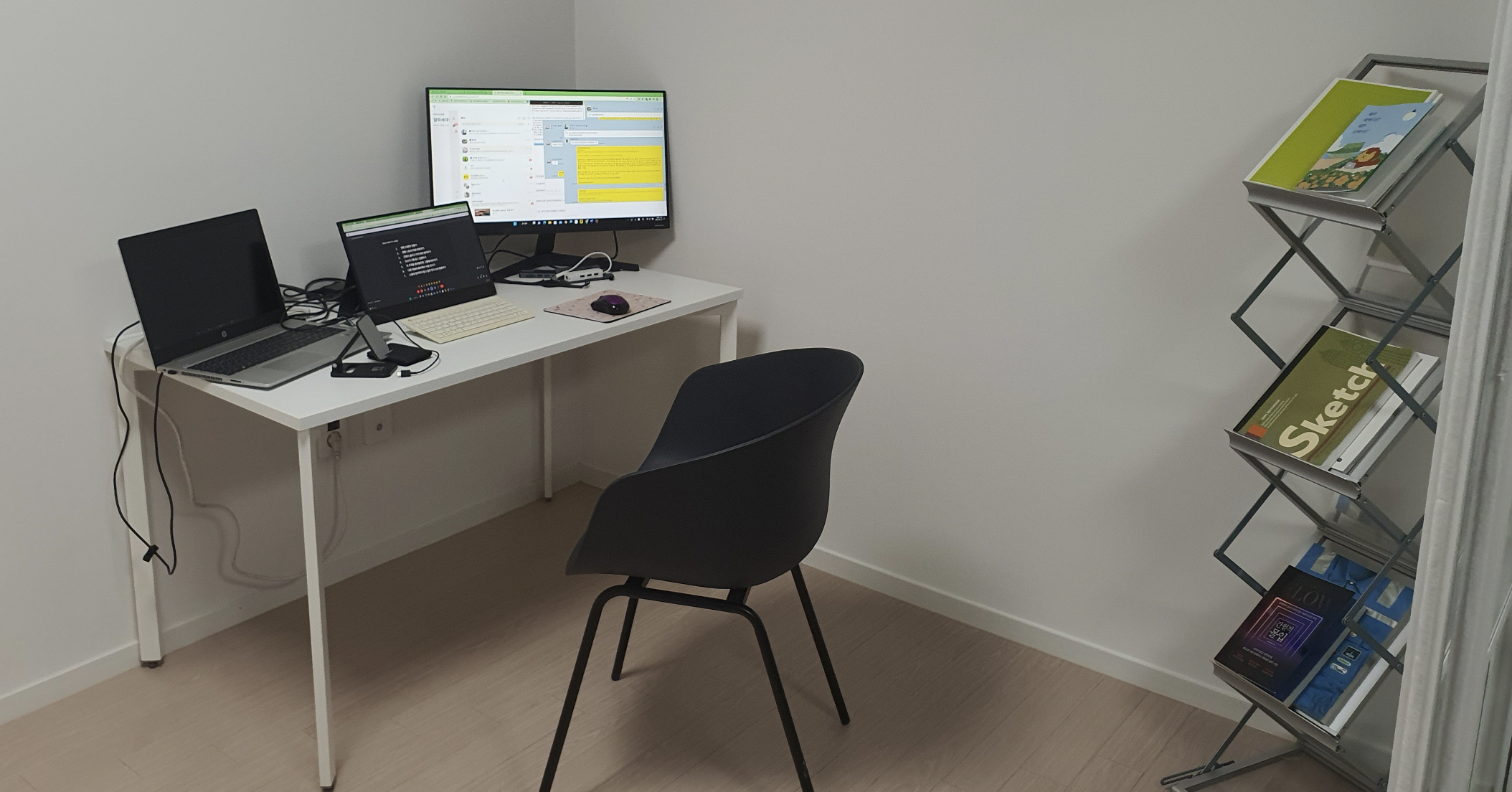 하지만 그렇게 서 있는 것도 잠시. 흘러가는 시간을 자각하는 순간부터 현실로 돌아와 분주히 움직이기 시작했다. 내가 가져온 짐을 새로운 공간에 배치하고 일할 공간에 노트북 컴퓨터와 휴대용 모니터를 올려놓고 케이블을 연결했다. 익숙한 작업환경을 빼곤 모든 것이 완전히 달라진 내 주변...
