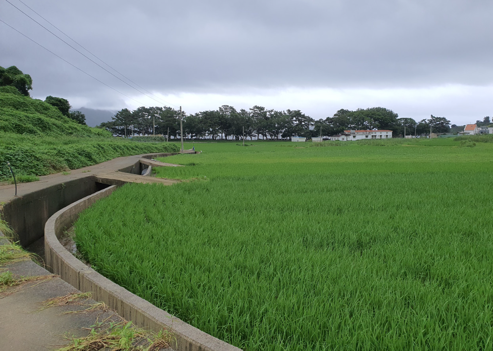 가지 않은 길이 나에게 주는 기대감과 도파민을 쫓아 계속 길을 따라갔더니 나오는 고즈넉한 마을. 해안도로도 아닌 바래길로 들어선 마을은 느낌이 새로웠다. 바람에 일렁이는 논밭뷰가 흐린 하늘에서 시선을 거두게 해 주었고, 솔솔 부는 바람에 청량감이 느껴졌다.