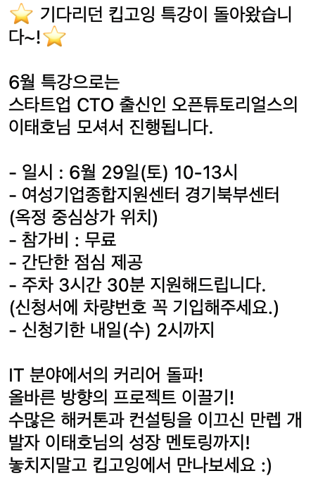 지난 금요일인 어제, 스타트업 CTO 출신인 오픈튜토리얼스의 이태호님의 기술 특강 공고를 갑작스럽게 접하게 되었다.