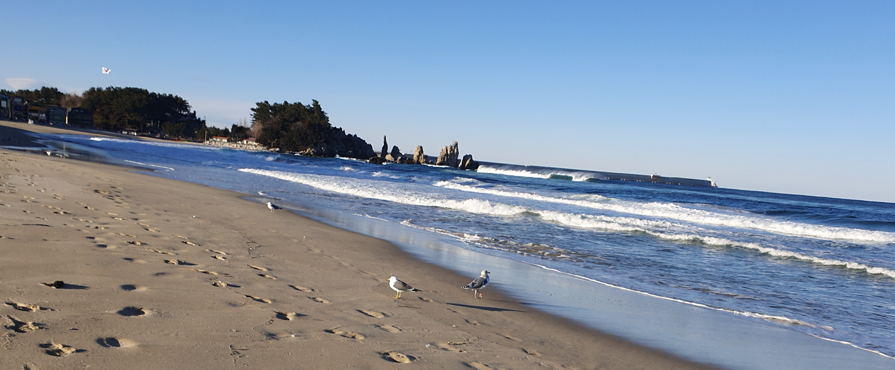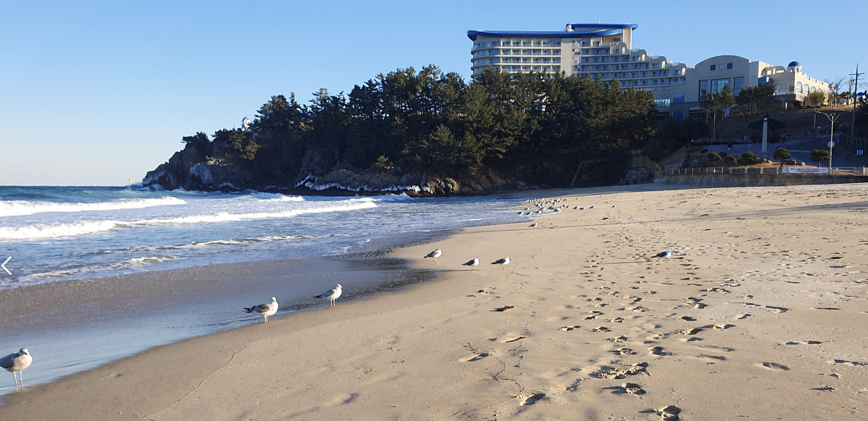 그렇게 뻥뚫린 여행길 끝자락에는 겨울 해변이 우리를 맞이해주었고, 잠시 겨울바다가 펼치는 하늘보다 짙은 파란색 파도의 향연을 잠시 즐기다가 예약한 호텔의 숙소에 체크인 하였다.
