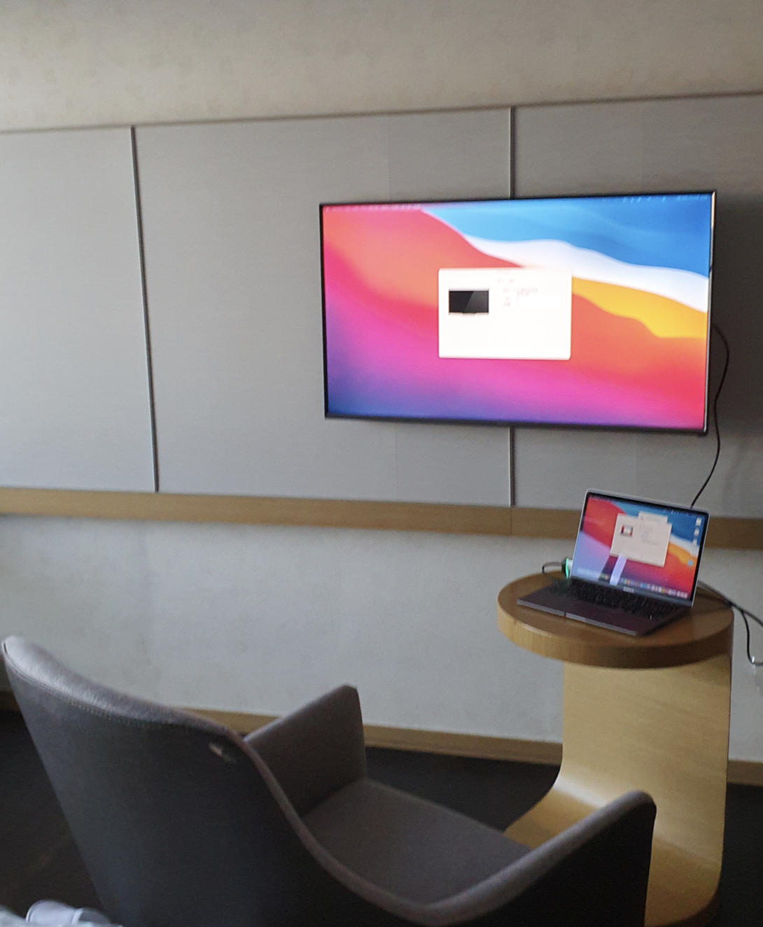 탁상과, 의자 두개, 벽걸이TV 등을 한대 모아 작업공간을 만들었고, 인터넷 연결 OK, 가져온 HDMI케이블을 이용해 티비와 연결하여 듀얼모니터 OK. 원격으로 작업 중이던 개발환경에 붙어 깃랩(Gitlab)으로 소스코드를 내려받아 동기화하고 개발 IDE를 실행하여 프로그램 동작을 확인한 결과 OK.