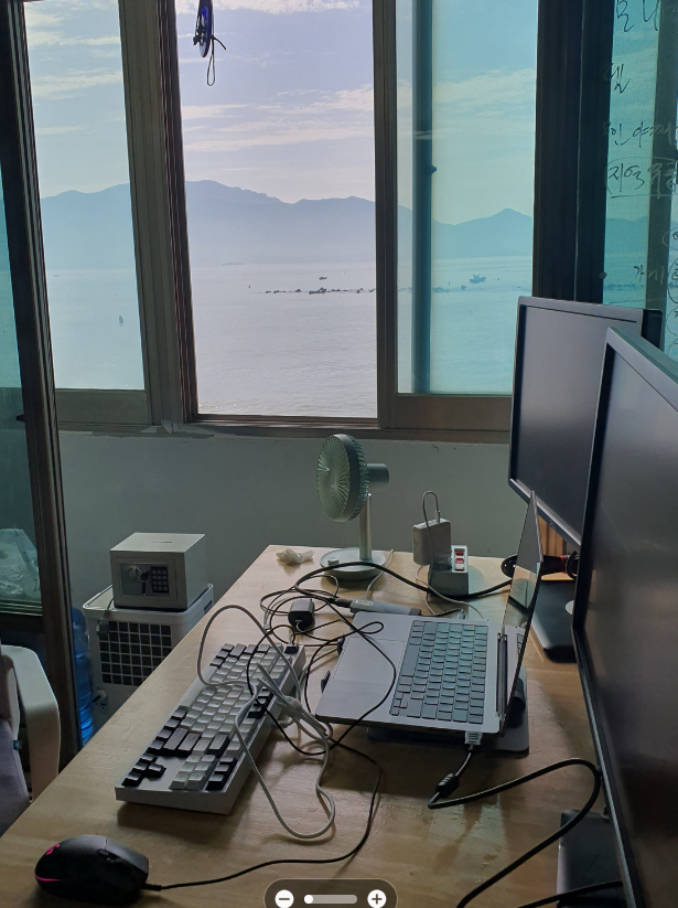 업무집중을 위해 잠깐씩 유튜브에서 파도소리와 같은 백색소음을 찾아서 틀어놓곤 했는데 지금은 그야말로 라이브 실황이다. 그 잔잔한 파도 소리가 하루종일 들리고 나도 모른채 나와 마주하며 업무에 집중한 채로 시간 가는 줄 모르고 시간을 보낸다.