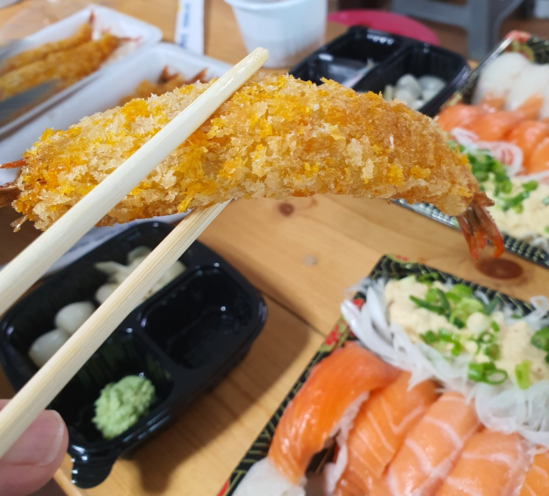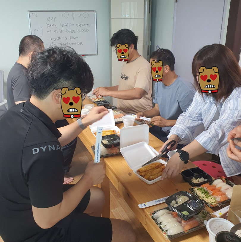 그렇게 물아 일체가 되어 열띤 오전 강의를 마치니 점심 시간이었다. 강수님은 시간맞춰 남해의 유명한 초밥집에서 공수해온 초밥과 새우튀김을 펼쳐놓았고, 우리는 맛의 향연에 취해 아침 강의 내용은 싹 다 날리고... 즐거운 점심 시간을 가졌다.