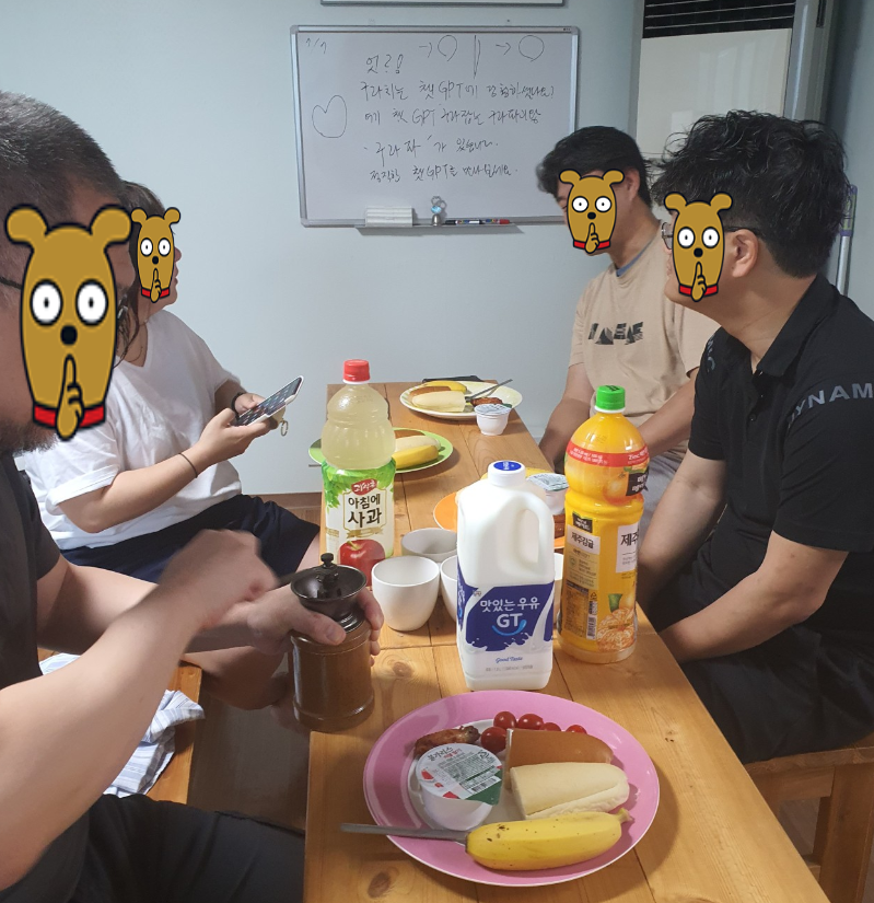 어제는 토요일임에도 불구하고, 한자리에 모인 참가자들 간에 뜻 깊은 워케이션을 보내보자는 취지하에 숙번님을 초청하여 강의와 간담회를 하루종일 진행했다. 그리하여 명명된 토요 간담회. 오전에는 숙번님을 AI강사로 모시고 AI최신 기술을 이용한 챗봇 시스템의 기반 기술에 대한 강의를 다 같이 경청했다.